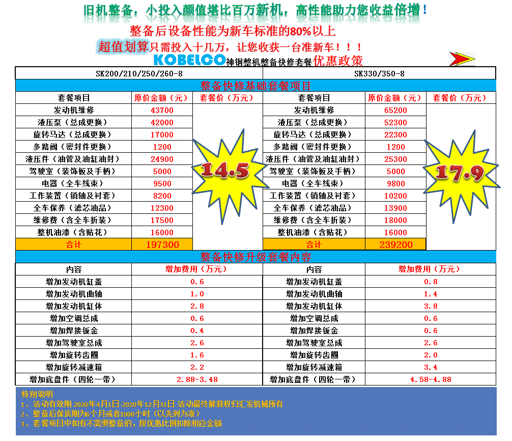 小投入、大回報!舊機換新顏,整備讓利力度超乎想象,史無前例直降30%!匯發機械以此助力神鋼老用戶持久創富。垂詢熱線:4008-883-884。